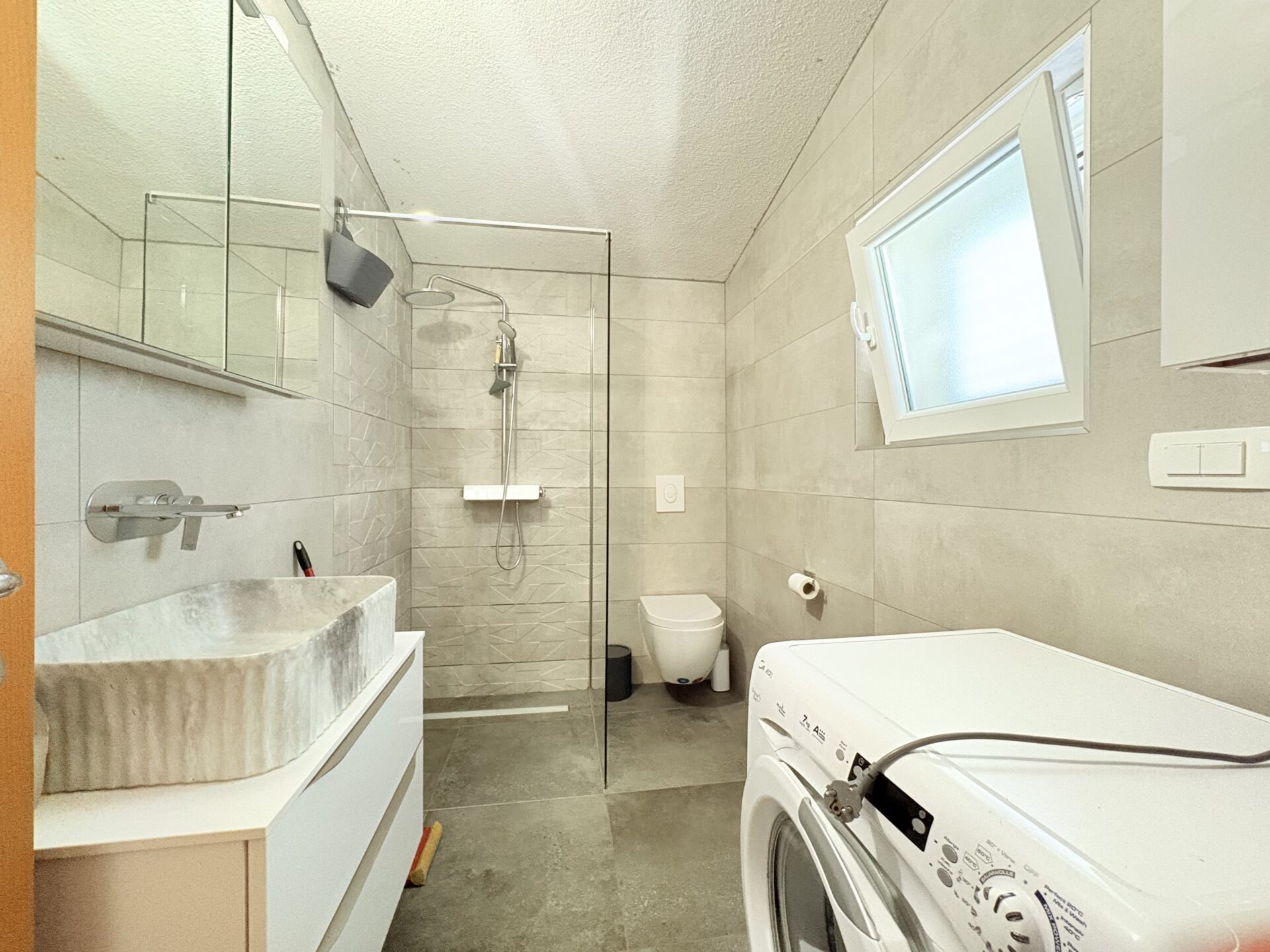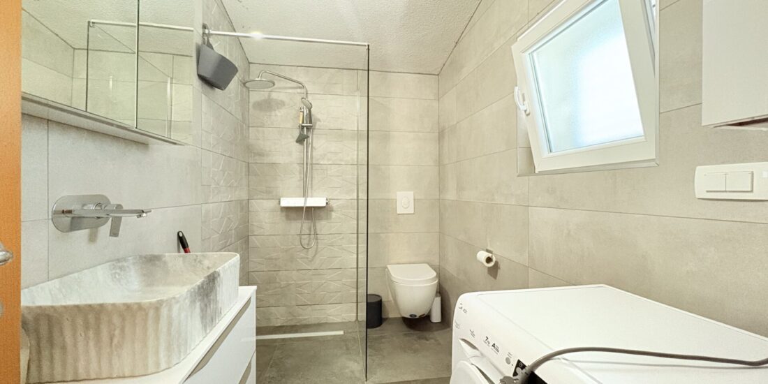 The interior uses large-format ceramic tiles 90 × 90 cm, which emphasizes the modern and luxurious character of the space. The bathrooms are equipped with high-quality sanitary ware from renowned brands Geberit, Grohe and Aquaestil, and the furniture is custom-made, achieving a high level of functionality and aesthetics.